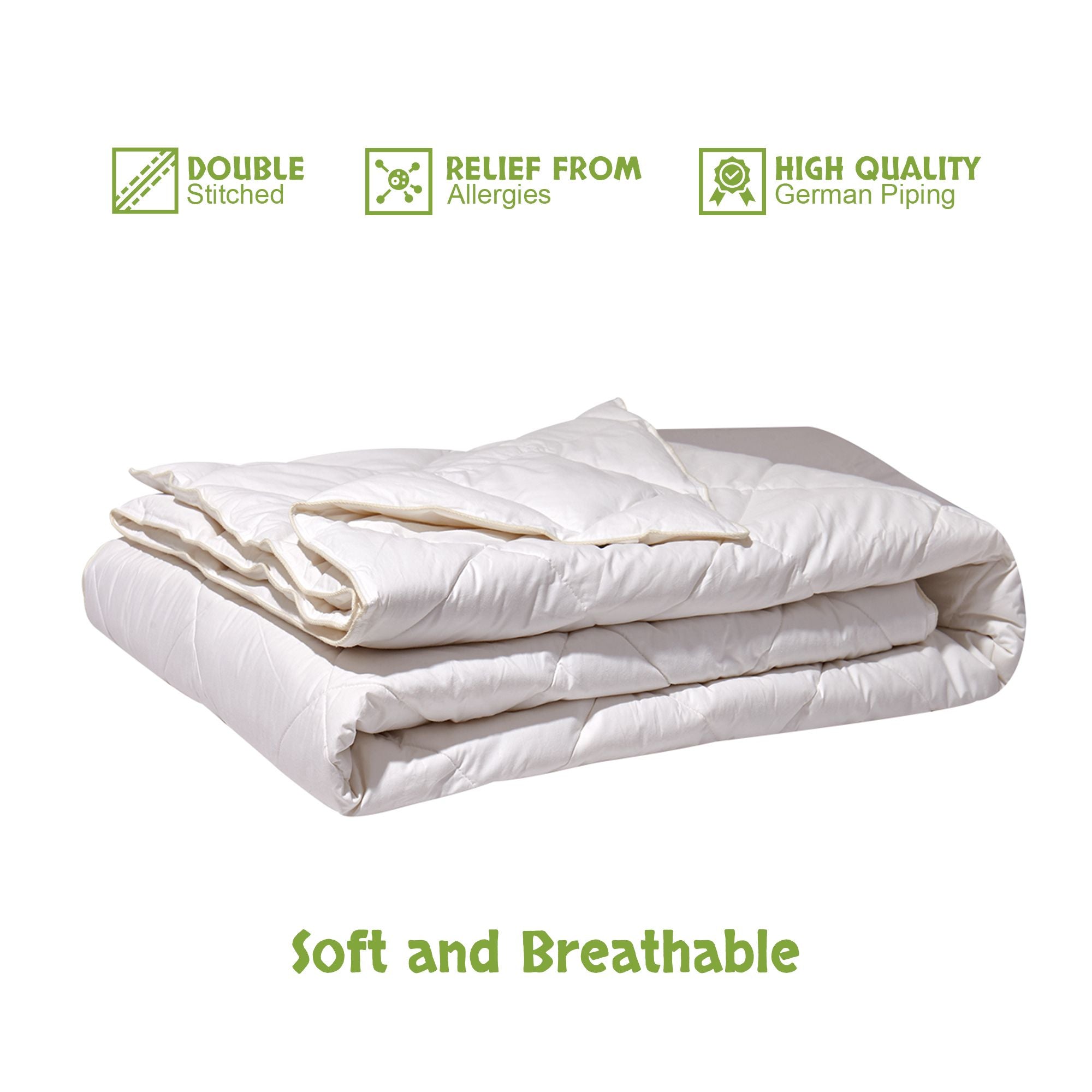 Our Wool duvet is an all season duvet keeping you warm in the winter months and cool in the summer months. The wool wicks away moisture from your skin helping maintain the perfect body temperature throughout the night for the perfect sleep. Wool is hypoallergenic for those who are sensitive to allergies. Wool provides natural resistance to dust mites.